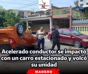 Aparatoso accidente vial protagonizó el conductor de un automóvil, quien al desplazarse con exceso de velocidad perdió el control del volante y chocó con un vehículo estacionado, para terminar su unidad llantas arriba.