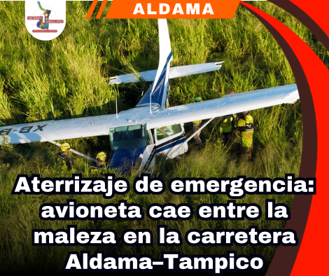 Aldama, Tamaulipas. – Una avioneta con matrícula XB-BCW, que realizaba un vuelo procedente de McAllen, Texas, con destino a Tampico, realizó un aterrizaje de emergencia entre la maleza, a la altura de la carretera Aldama–Tampico.