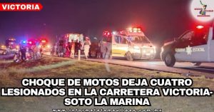 Ciudad Victoria, Tamaulipas.-Cuatro personas lesionadas entre ellas un bebe de brazos, fue el saldo preliminar que arrojó un choque entre dos motocicletas esta noche, en el kilómetro 11 de la carretera Victoria-Soto La Marina.