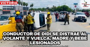 Ciudad Victoria, Tamaulipas. –Una mujer de aproximadamente 25 años y su bebé de brazos resultaron lesionadas este medio día tras volcar el auto de la plataforma Didi en el que viajaban, cuando el operador se distrajo al volante y se estrelló contra la valla de contención del puente conocido como “La Joroba”