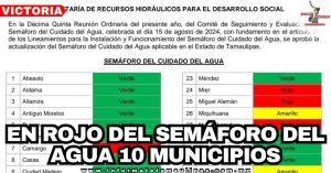 El Comité de Evaluación del Semáforo del Cuidado del Agua, estableció que 33 municipios del estado superaron la crisis hídrica, mientras que los municipios de Camargo, Guerrero, Gustavo Díaz Ordaz, Matamoros, Mier, Miguel Alemán, Nuevo Laredo, Reynosa, Río Bravo y Valle Hermoso continúan en color rojo.