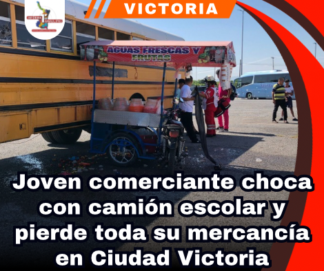 Ciudad Victoria, Tamaulipas. – Un menor comerciante que se dedica a la venta de aguas frescas y frutas resultó lesionado esta mañana tras impactar su triciclo contra un camión escolar en el estacionamiento del Polideportivo, ubicado en la salida a Matamoros.