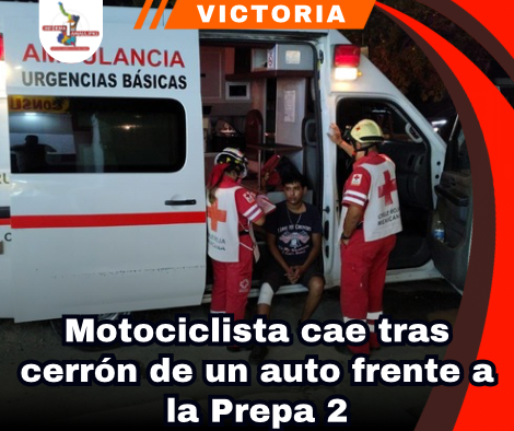 Ciudad Victoria, Tamaulipas.– Un motociclista resultó con golpes leves luego de caer de su unidad al ser cerrado por un vehículo la noche del miércoles, frente a la Escuela Preparatoria Número 2.