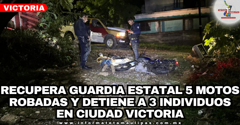 Ciudad Victoria, Tamaulipas. – Elementos de la Guardia Estatal lograron recuperar cinco motocicletas que habían sido robadas y detuvo a tres masculinos presuntamente implicados en los robos.