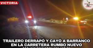 Jaumave, Tamaulipas. – Un chofer de trailer resultó lesionado cerca de la media noche al perder el control de su pesada unidad y caer a un barranco, en el kilómetro 37 de la carretera estatal 126 tramo Juan Capitán-Chihue, a la altura del Ejido San Antonio.