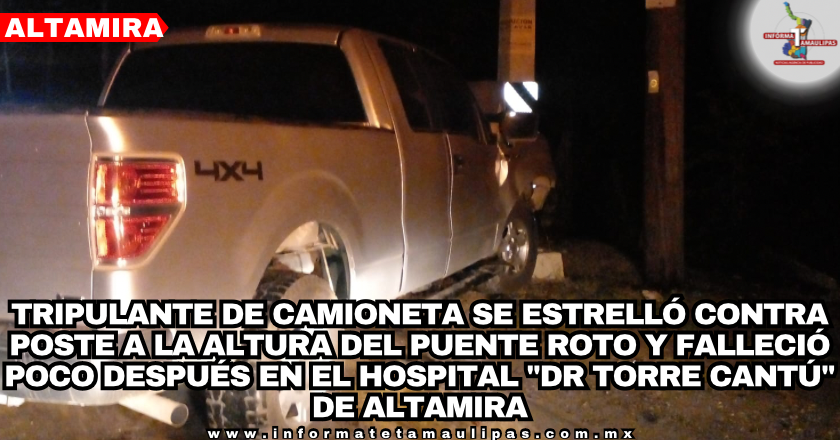 Horas después de haber sido ingresado al área de urgencias del Hospital General de Altamira, «Dr Rodolfo Torre Cantú», un hombre falleció mientras era atendido después de impactar su camioneta contra un poste a la altura del llamado Puente Roto.