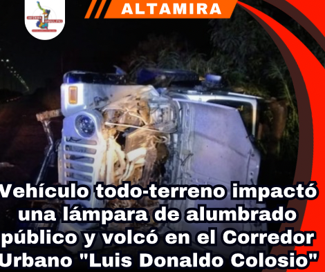 Volcado sobre un costado y prácticamente destrozado, fue localizado un vehículo todo-terreno que previamente se impactó contra la base y poste del servicio de alumbrado público, unidad que fue abandonada pero cuyos tripulantes aparentemente resultaron lesionados, ya que se encontraron en el sitio huellas de sangre.