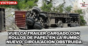 Ciudad Victoria, Tamaulipas. -Un tracto camión doble articulado que transportaba rollos de papel en contenedores, volcó esta mañana en el kilómetro 13 de la carretera Rumbo Nuevo, provocando la obstrucción a los carriles de circulación.